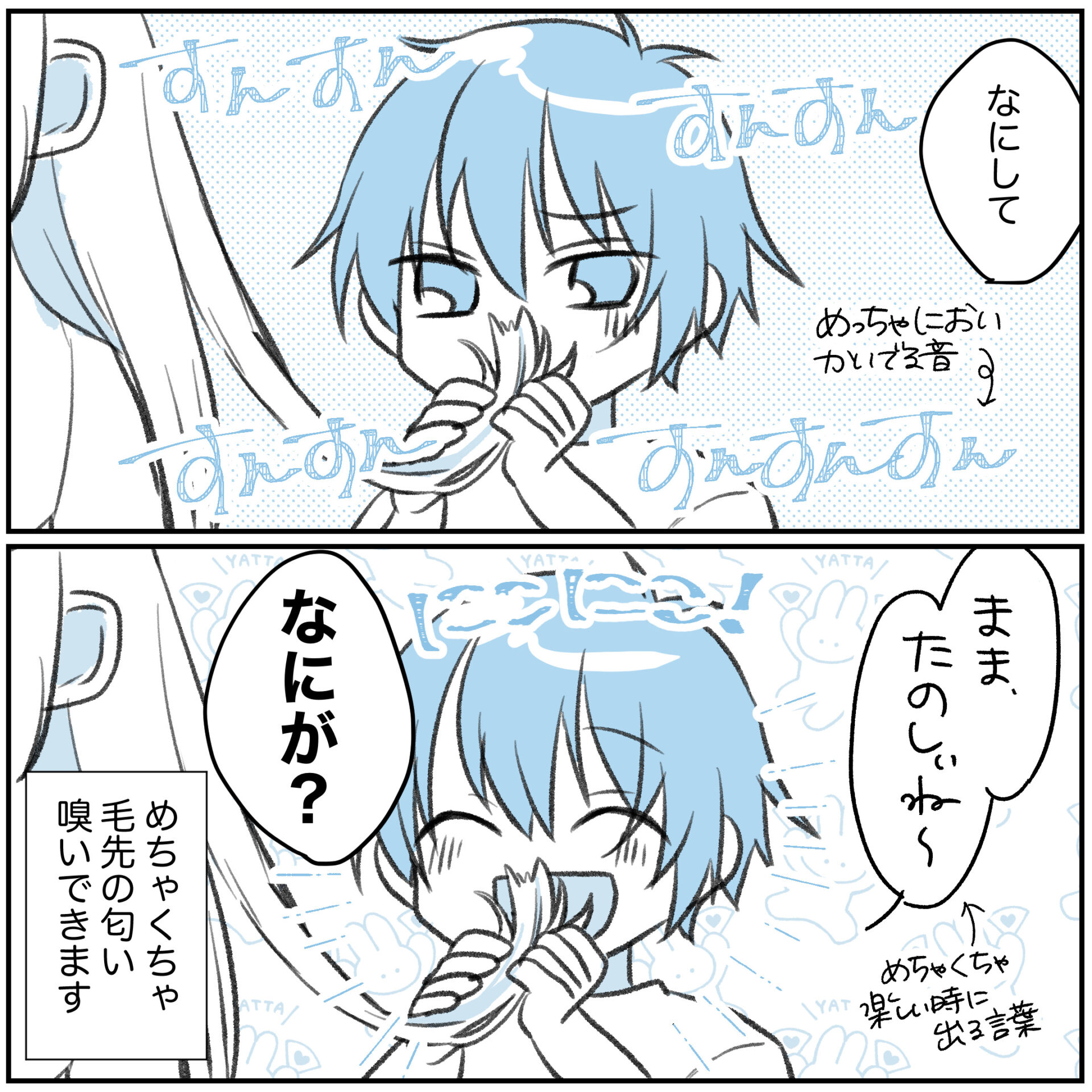 スポンサーリンクおすすめ記事付き添い入院大変でした〜マイコプラズマ③〜付き添い入院大変でした〜マイコプラズマ②付き添い入院大変でした〜マイコプラズマ①3歳になりました飲むのも飲ませるのも下手くそすぎて完ミにした話⑥ 謎の癖2023.08.17スポンサーリンクあとがき臭い?臭いの?と思ったけど特に臭くない…はず…母親の匂いがいいんじゃないの?とも言われましたけど、そういうのって普通体とか、服とか、同じ頭でももっと頭皮の方だったりするんじゃないのかな!?!?なんで毛先なの!?!ちなみに当たり前だけどくすぐったいらしくてゲラゲラ笑ってます。これで1時間くらい持つので引っ張らない限りはもう…好きにさせている…1